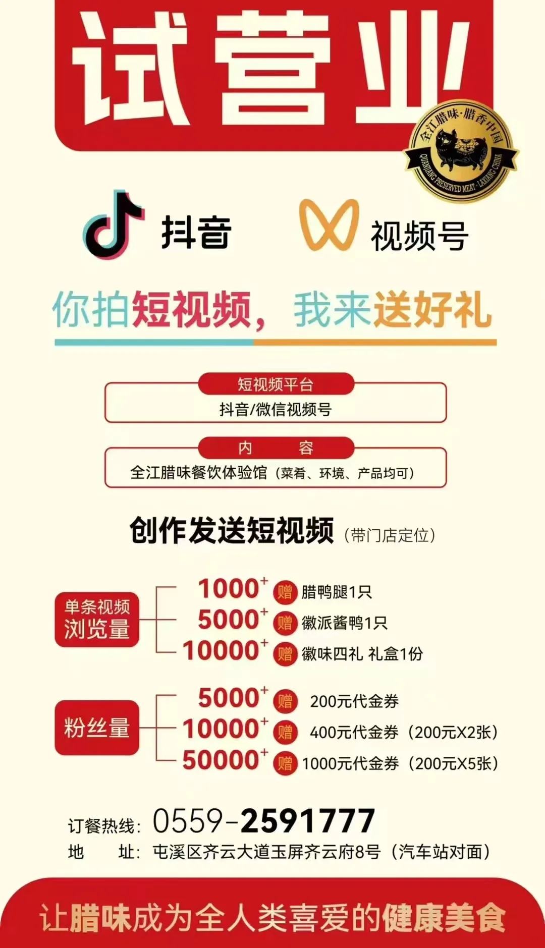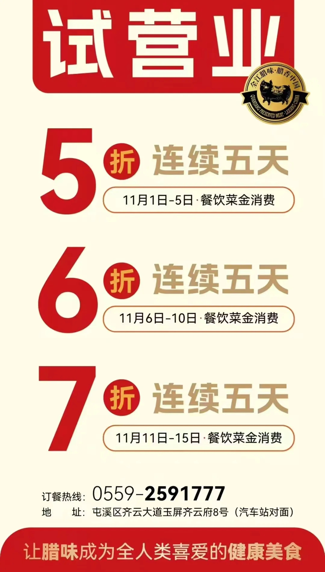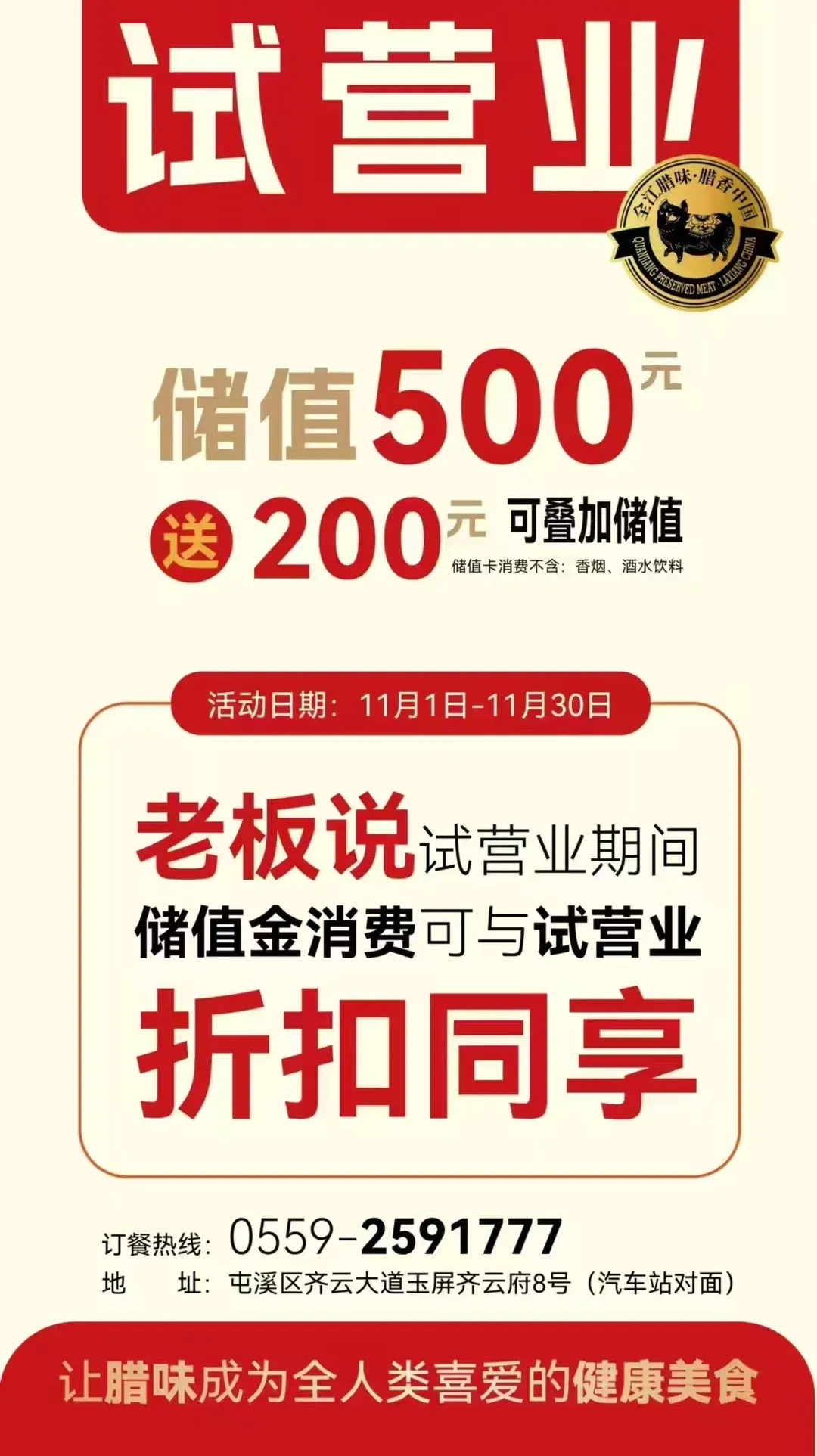 在試營業(yè)期間,我們誠摯地邀請每一位熱愛美食的顧客蒞臨,共同體驗一場前所未有的臘味盛宴。這里,不僅有豐富多樣、風(fēng)味十足的臘味菜品等待著您的品嘗,更有一系列來自黃山市三區(qū)四縣的地道土菜,讓您在享受傳統(tǒng)臘味的同時,也能領(lǐng)略到不同地域的特色風(fēng)味。